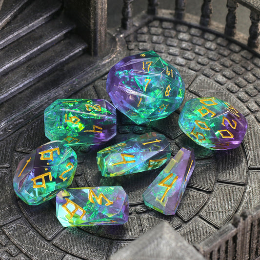Liquid Core DnD Dice Set 7 Piece Sharp Edge Resin DND Dice - Liquid Yellow and Green
