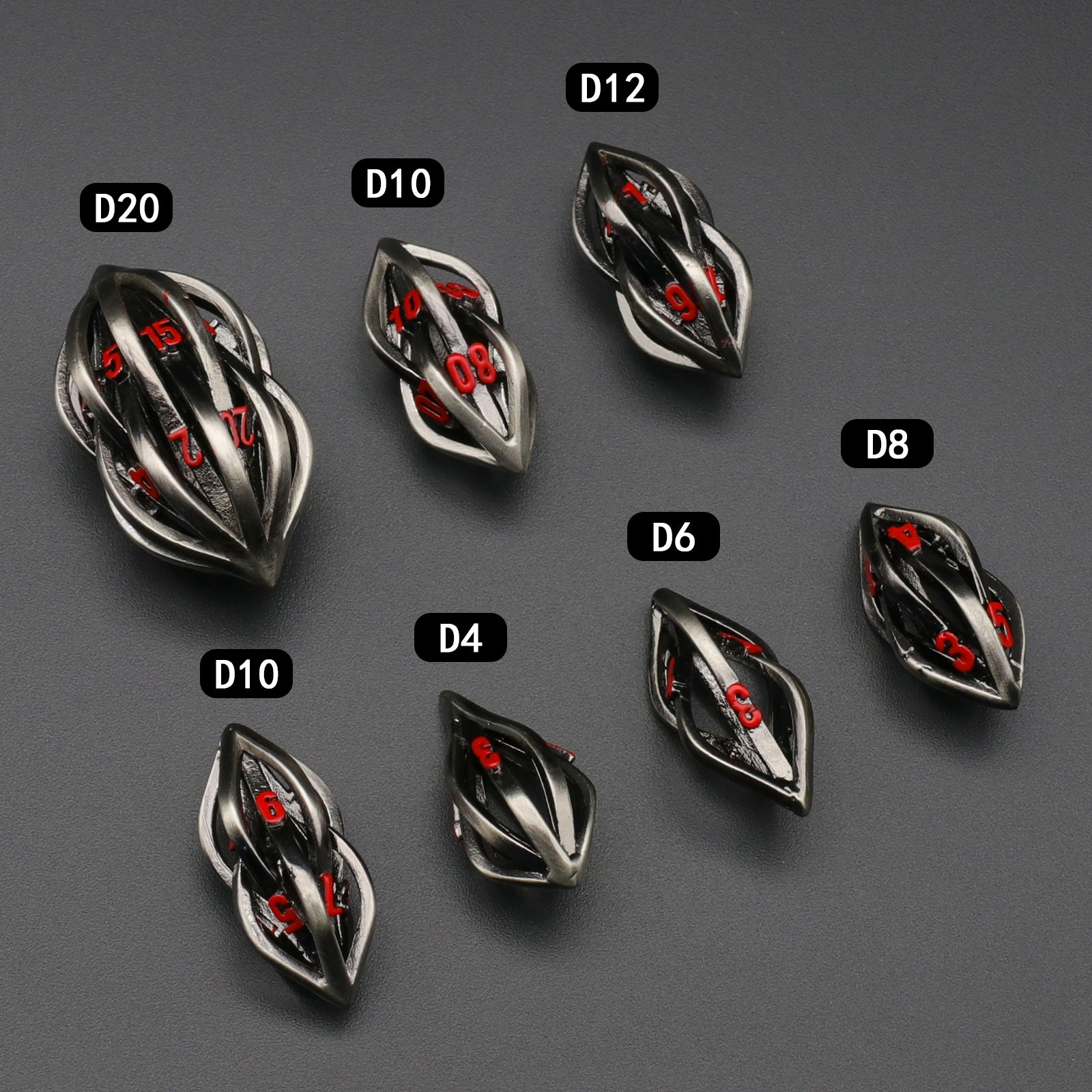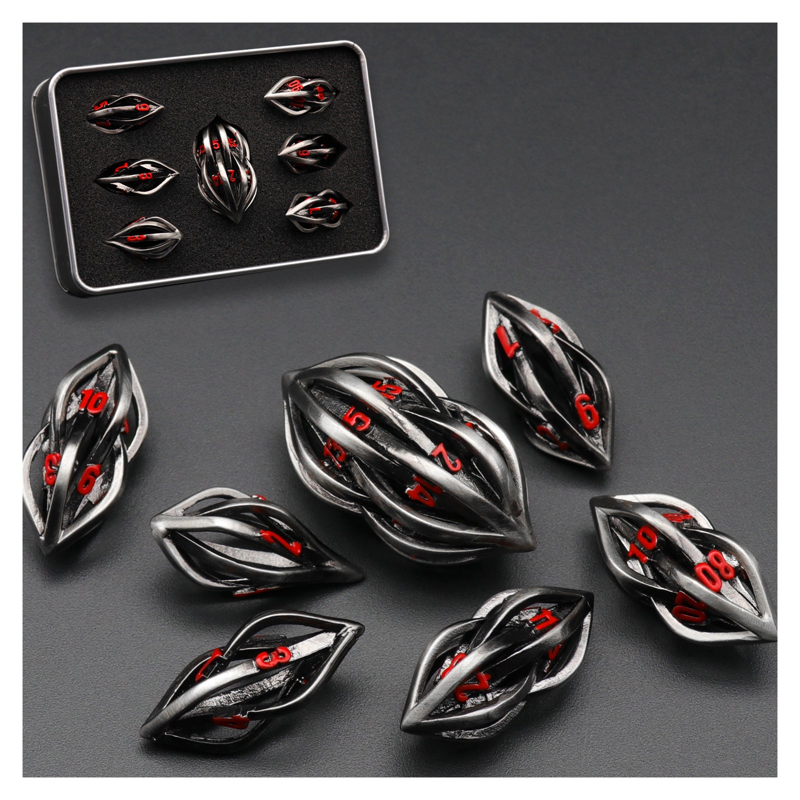 Arcanum DND Metal dice,Role Playing Gaming Dice Metal Dice Set D&D with Box Hollow Polyhedral Dice - Red Number