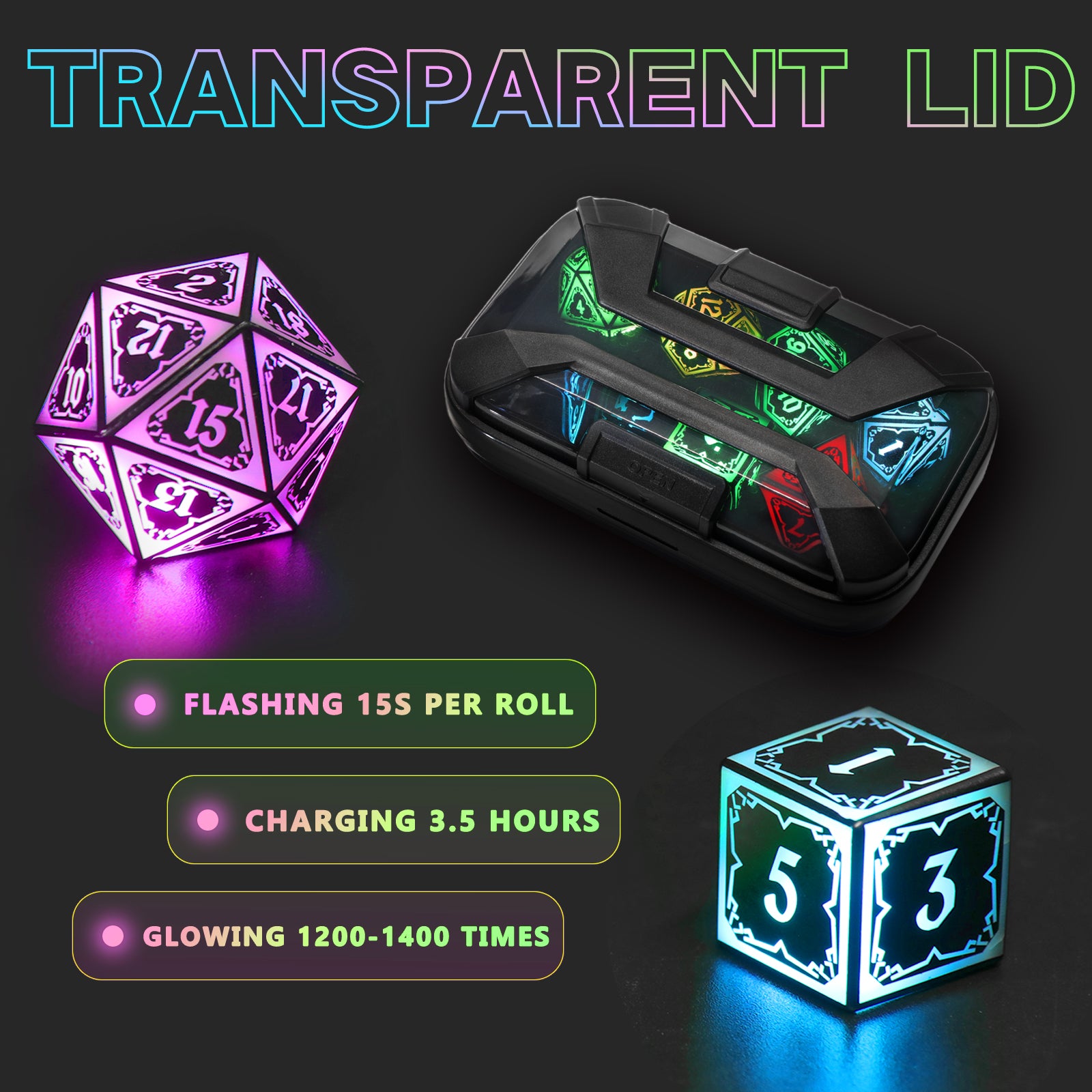 DND Dice Set - A set of 7 dice come with a charging bin, a type-c cable, instructions card and nice packing box, which is easy to carry to parties anytime and anywhere or as a perfect gift for DnD game players.