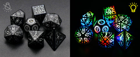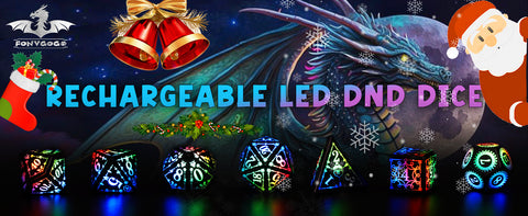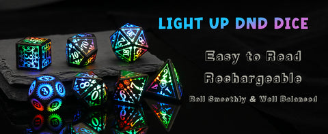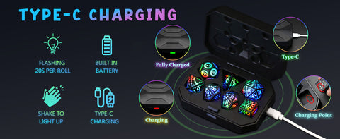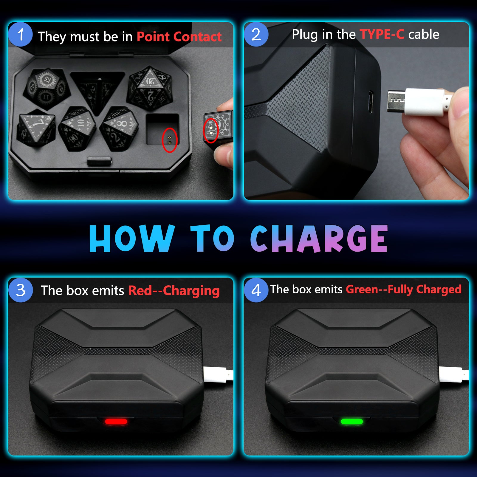 - Rechargeable LED Dice - A set of 7 dice come with a charging bin, type-c cable, instructions card and nice packing box, which is easy to carry to parties anytime and anywhere or as a perfect gift for D&D game players.