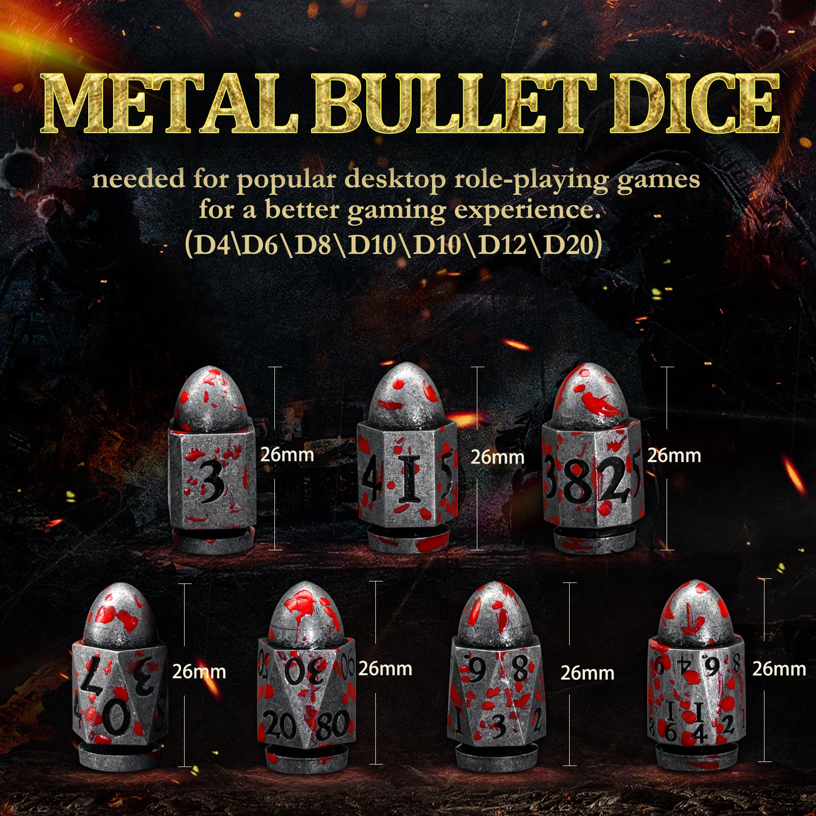 - COOL & UNIQUE DESIGN: Cool bullet design stand out on the gaming table, taking players into the world of dnd dice games. 7 pieces dice are marked with a number on the bottom, which can be easily and quickly distinguished. To protect table surface, it is recommended to use with trays and mats.