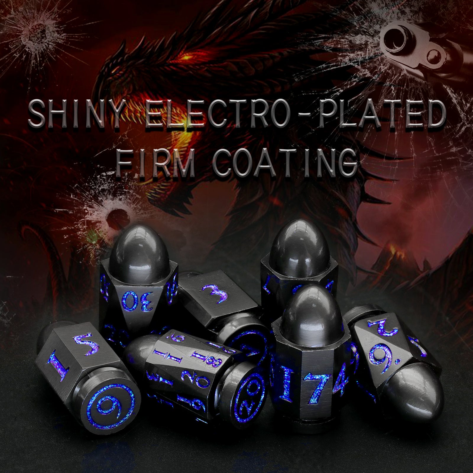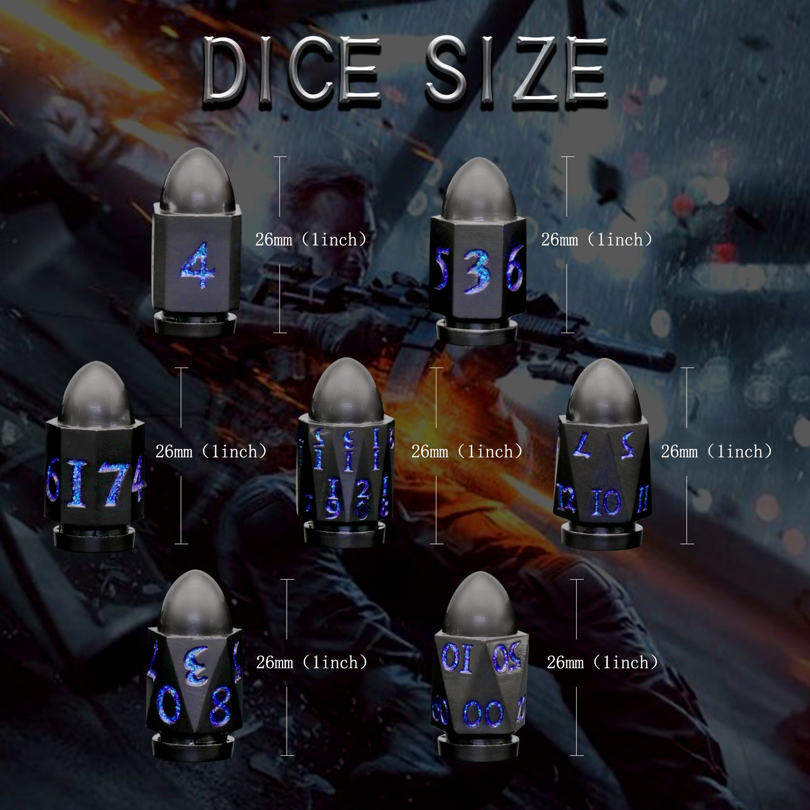 - COOL & UNIQUE DESIGN: Cool bullet design stand out on the gaming table, taking players into the world of dnd dice games. 7 pieces dice are marked with a number on the bottom, which can be easily and quickly distinguished. To protect table surface, it is recommended to use with trays and mats.