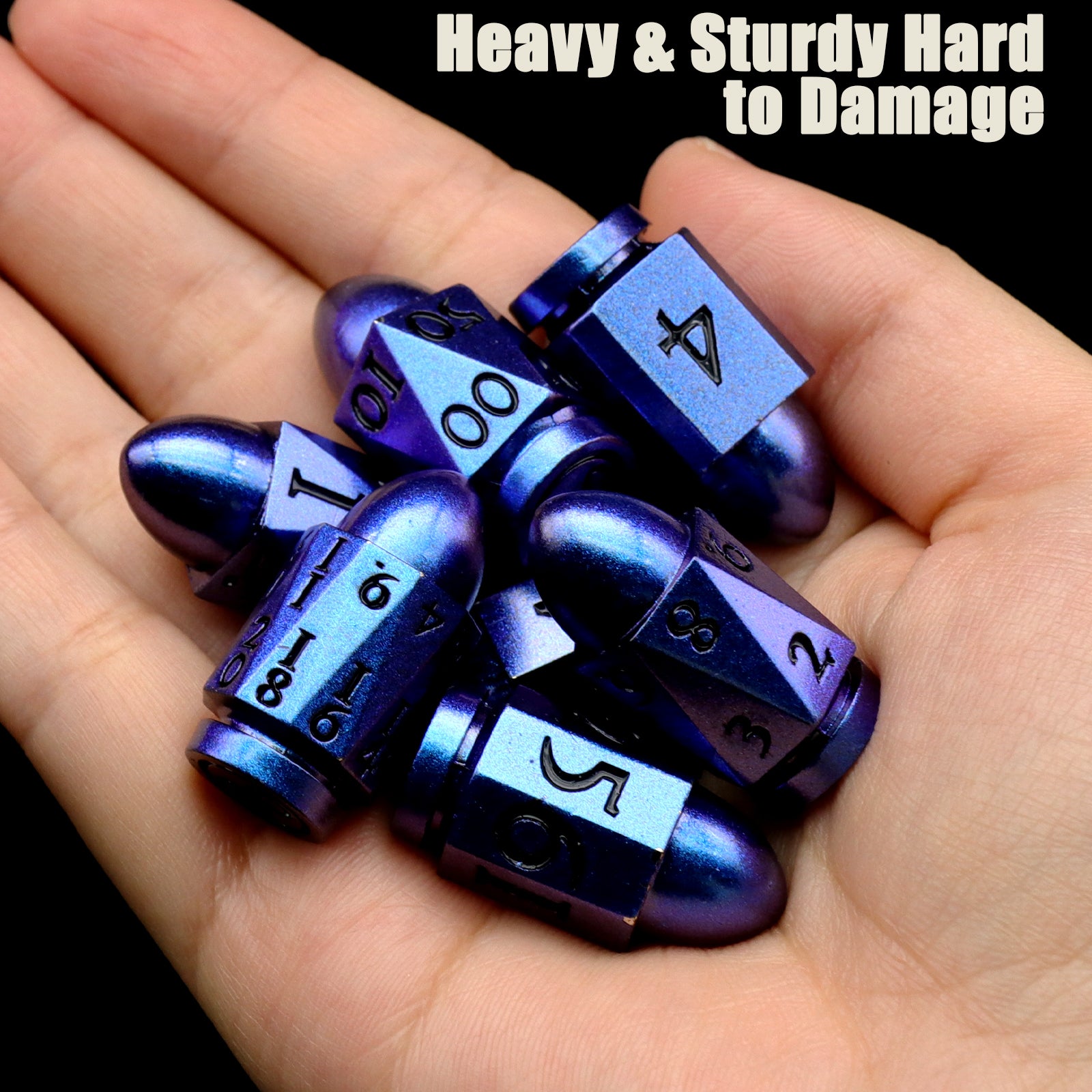- HIGH QUALITY METAL DICE SET: The bullet dice are made of solid metal giving them a nice and heavy feeling. Carefully electro-plated surface will not peel off like other baked counterparts. As a metal dice with durable coating, they are wear-resistant, smooth, flat and non-fading for years of continuous use.