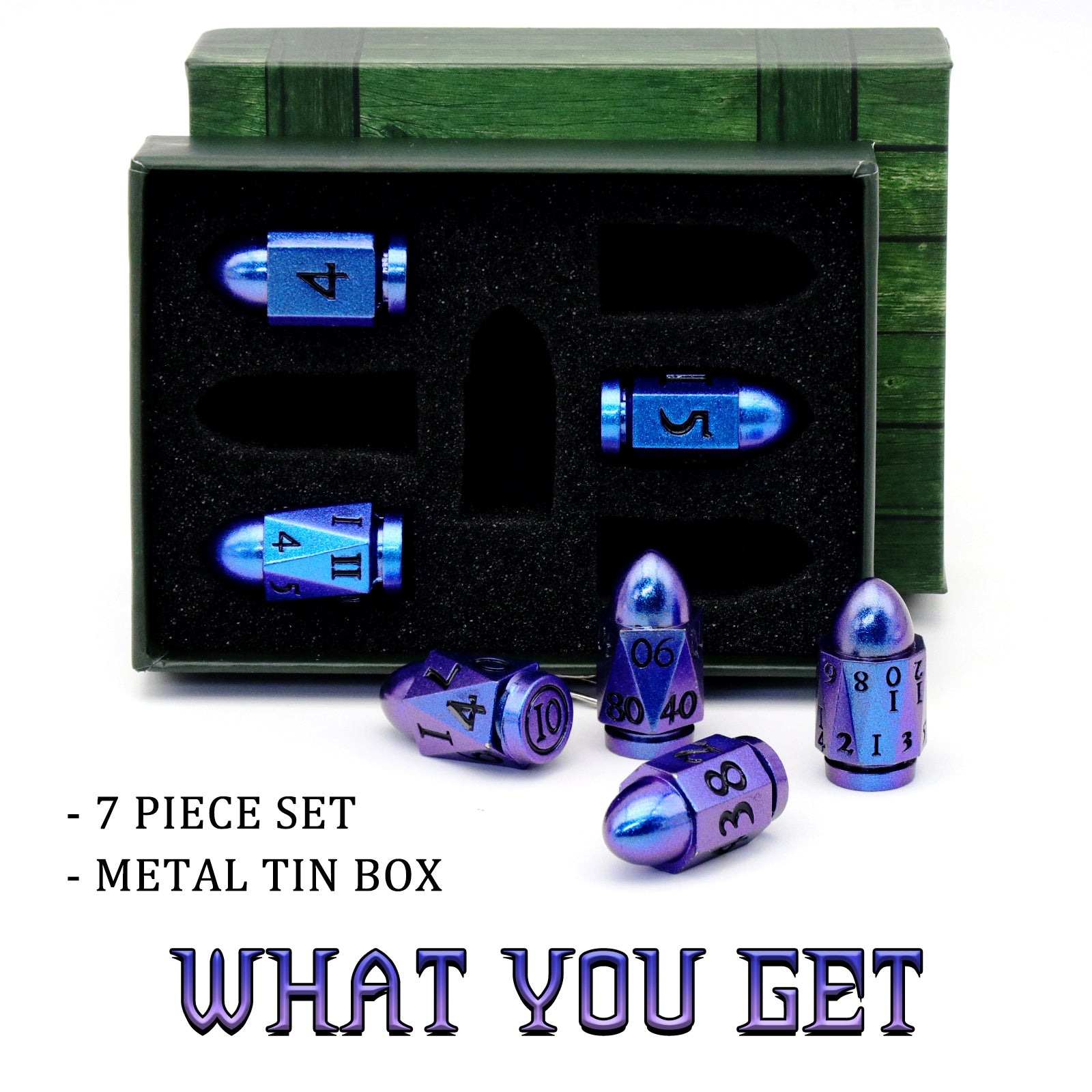 - COOL & UNIQUE DESIGN: Cool bullet design stand out on the gaming table, taking players into the world of dnd dice games. 7 pieces dice are marked with a number on the bottom, which can be easily and quickly distinguished. To protect table surface, it is recommended to use with trays and mats.