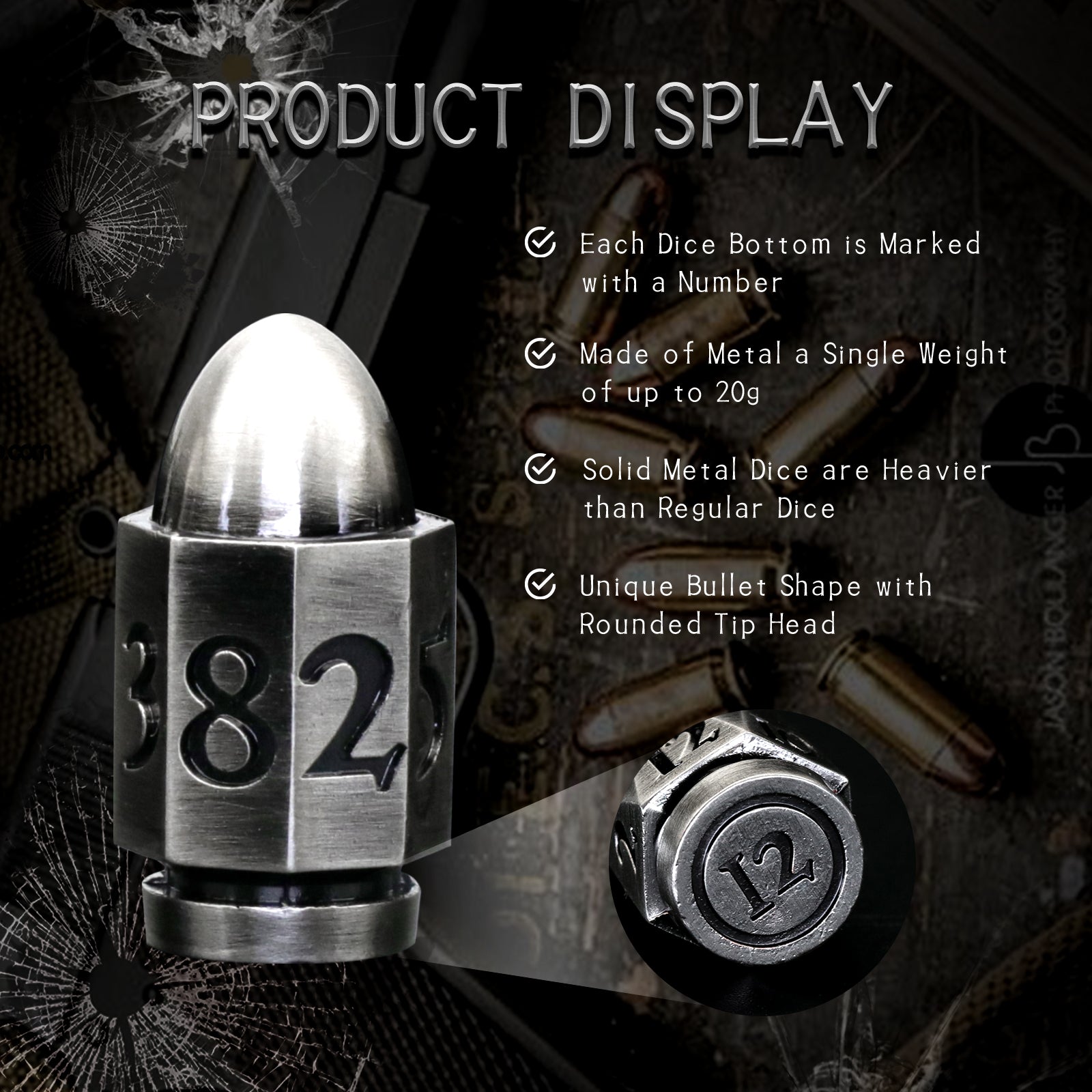 - HIGH QUALITY METAL DICE SET: The bullet dice are made of solid metal giving them a nice and heavy feeling. Carefully electro-plated surface will not peel off like other baked counterparts. As a metal dice with durable coating, they are wear-resistant, smooth, flat and non-fading for years of continuous use.