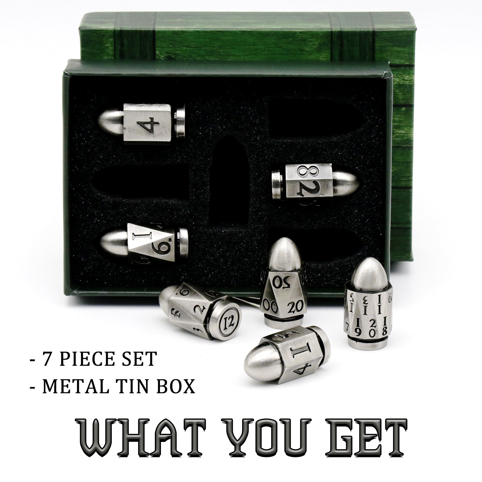 - NICE PACKAGE: The 7 pieces dice comes in a nice green cardboard box with foam inserts to easily carry them around and store them. For dnd lovers and players, the bullet metal dice will be a cool and surprising gift.