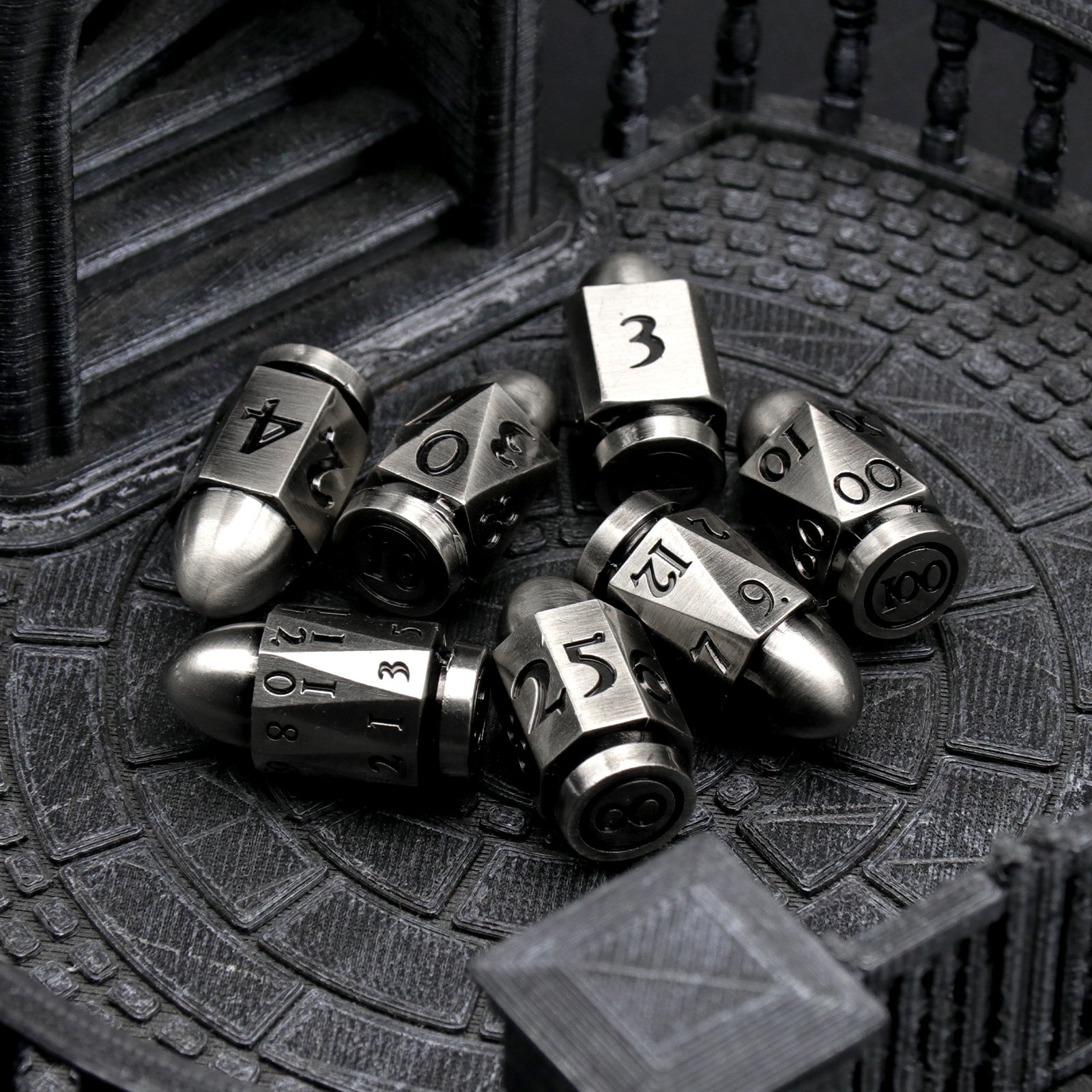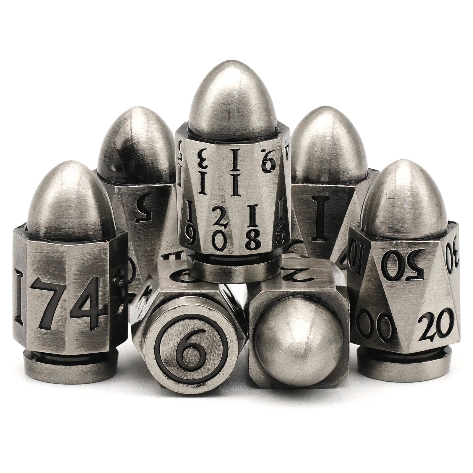 DND Metal Bullet Dice are a great choice for anyone who wants a set of durable and stylish dice for their Dungeons & Dragons or other tabletop RPG game. These dice are made from high-quality metal and have a bullet-like design that makes them stand out on the gaming table.