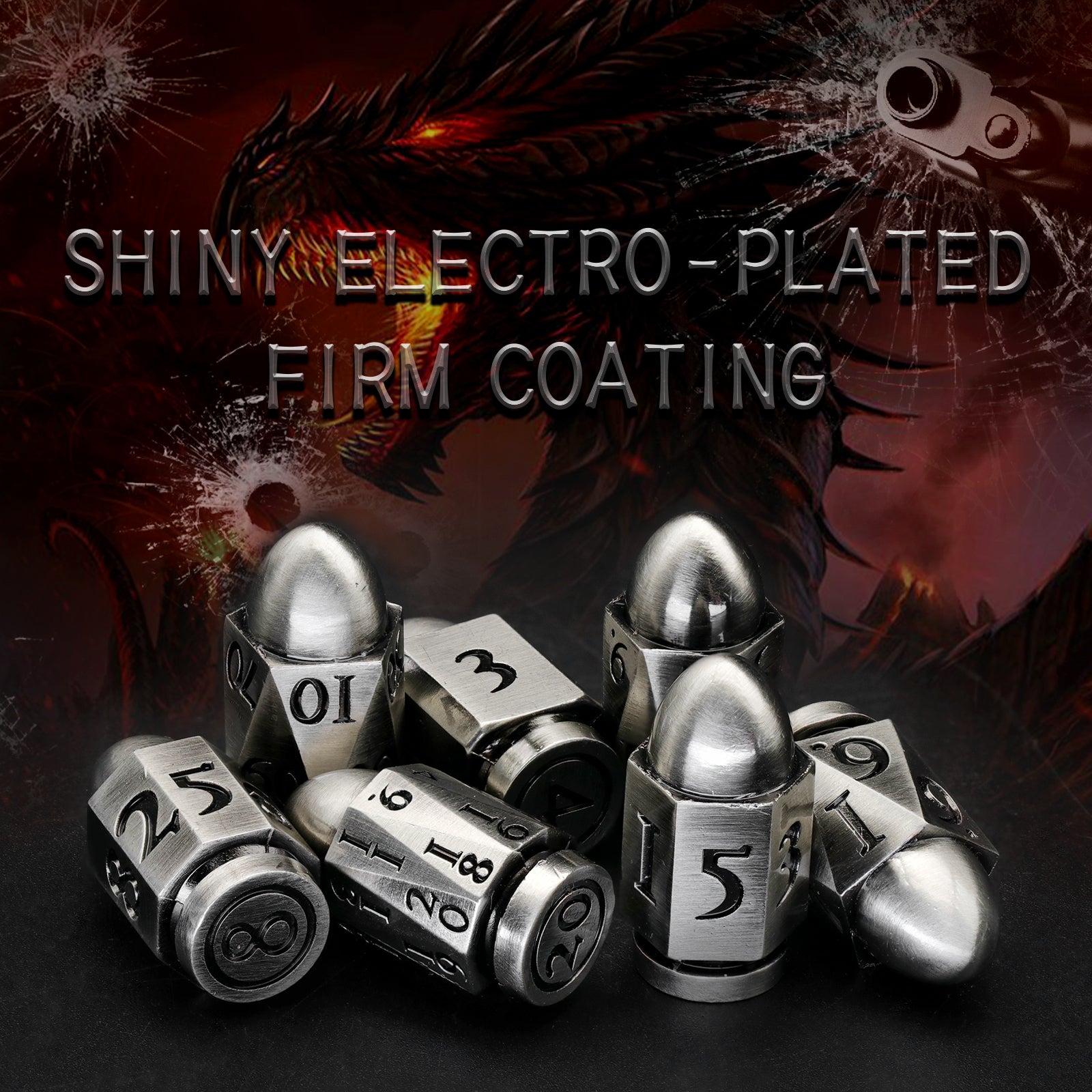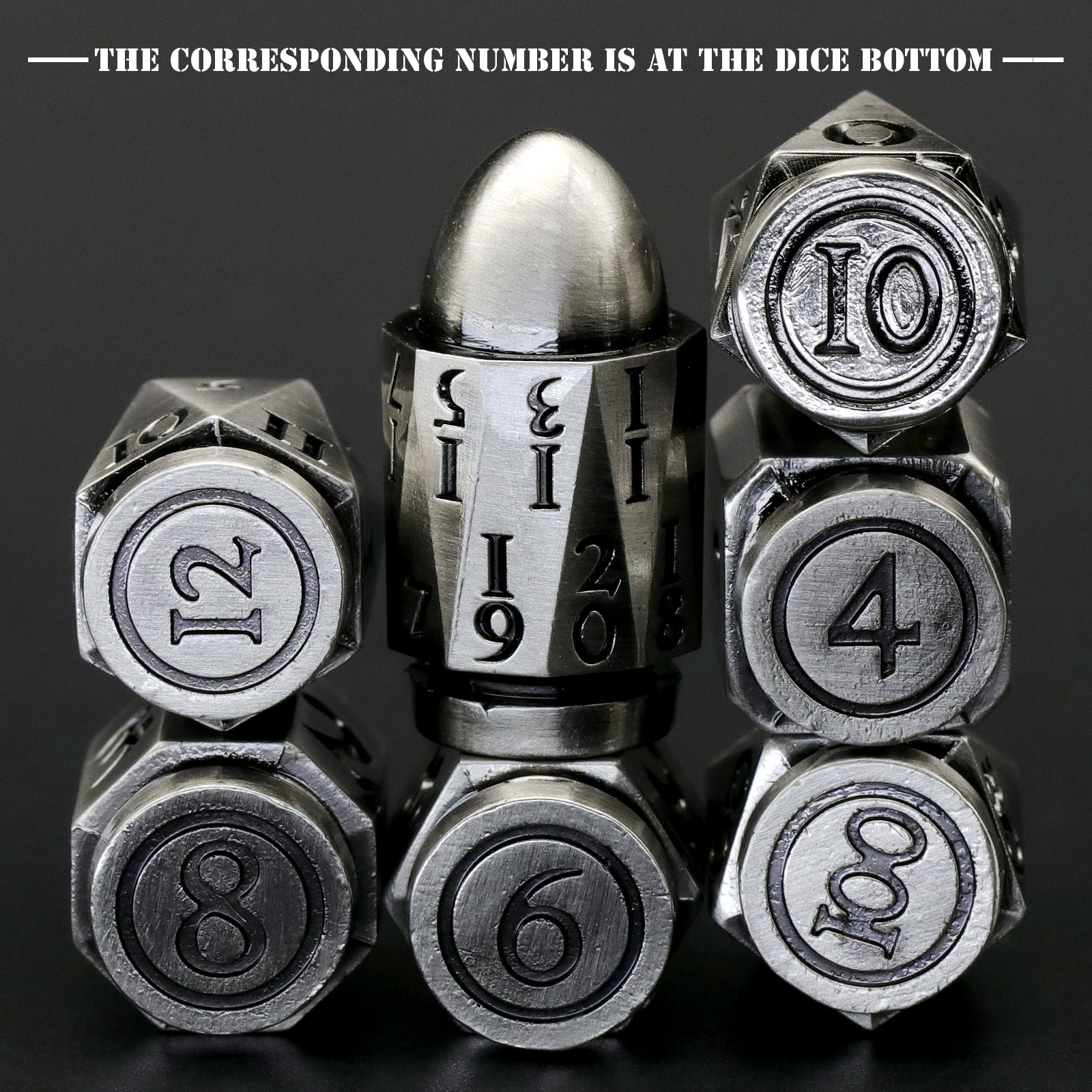- COOL & UNIQUE DESIGN: Cool bullet design stand out on the gaming table, taking players into the world of dnd dice games. 7 pieces dice are marked with a number on the bottom, which can be easily and quickly distinguished. To protect table surface, it is recommended to use with trays and mats.
