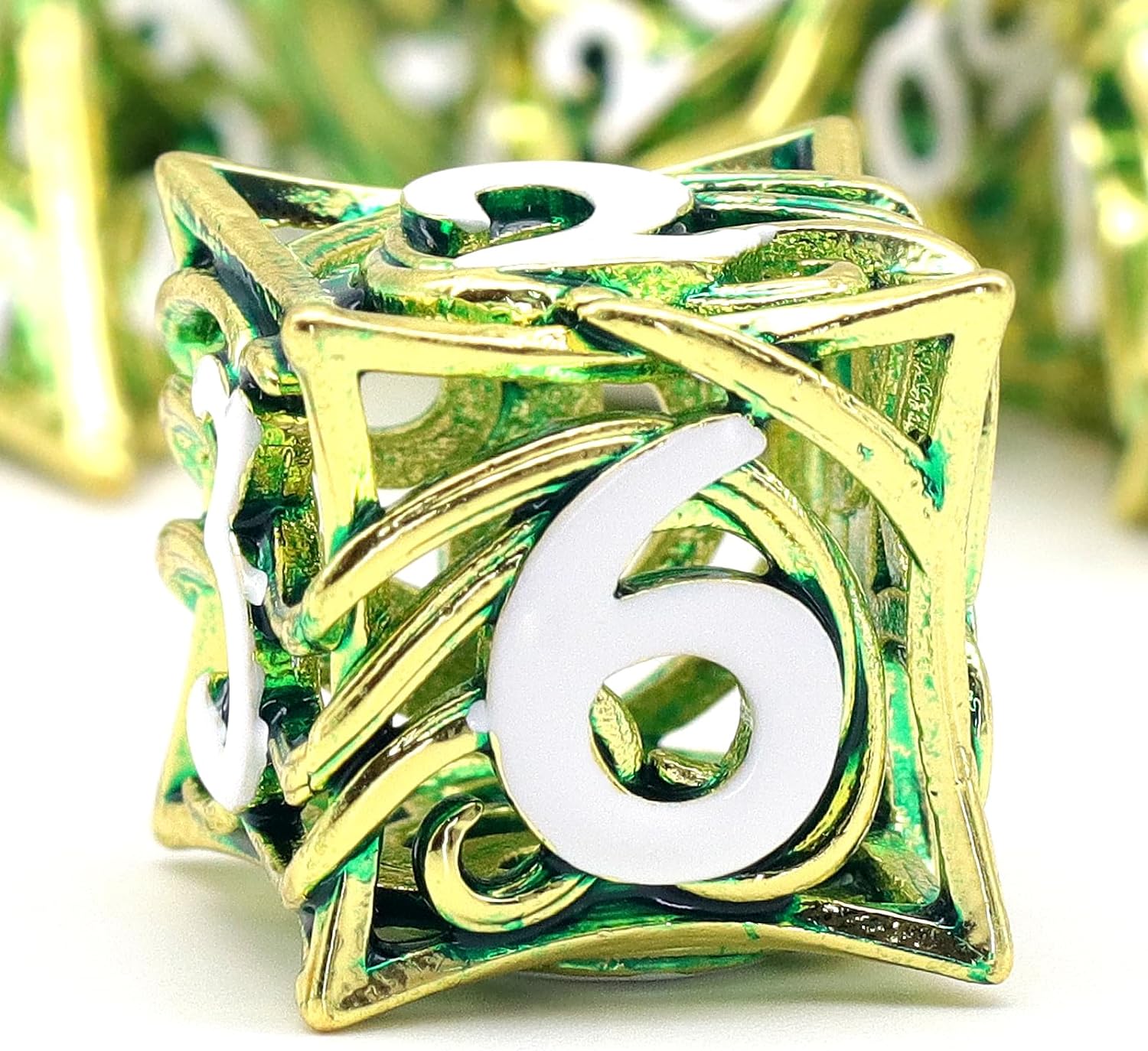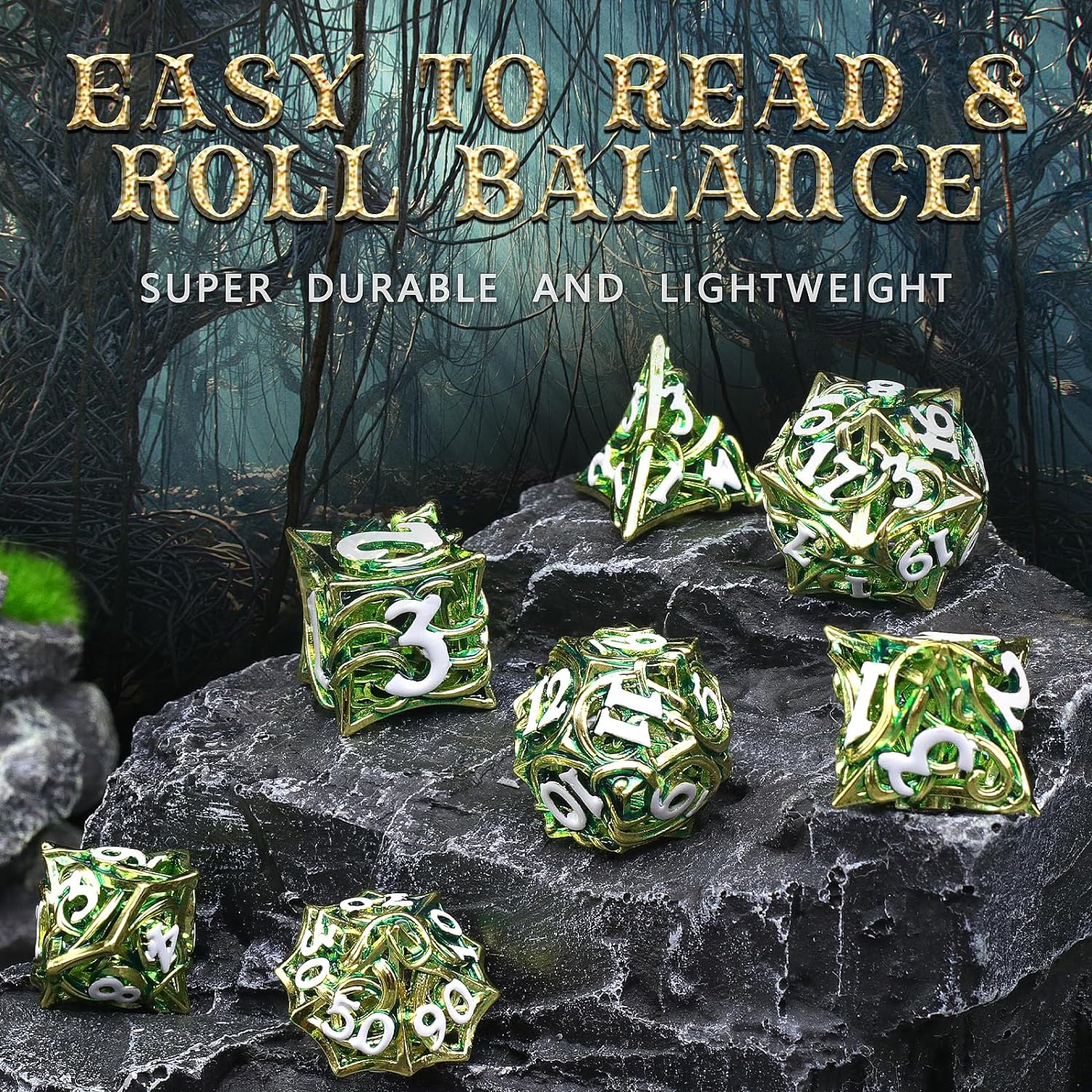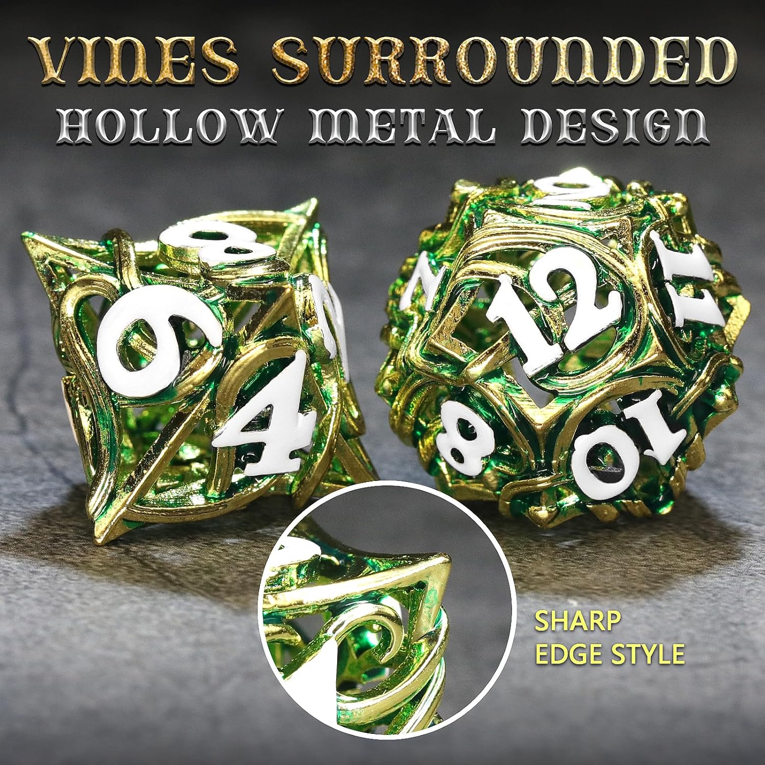7PCS Metal DND Dice Set Hollow Polyhedral Hollowl Vine Dice Set D&D Role Playing D and D RPG Dice ( Green)
