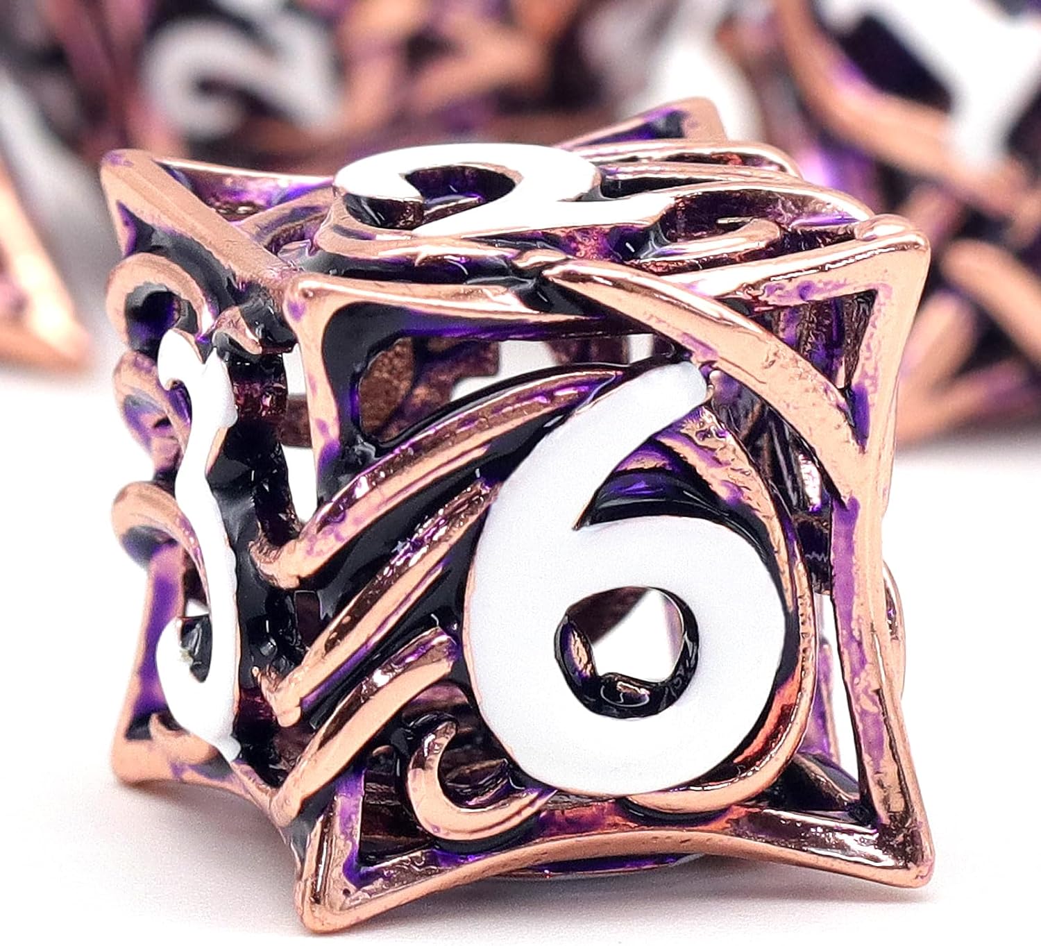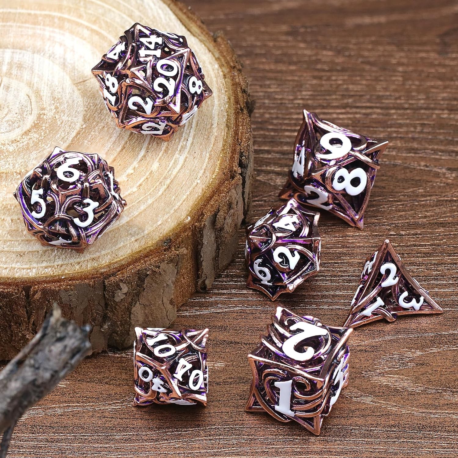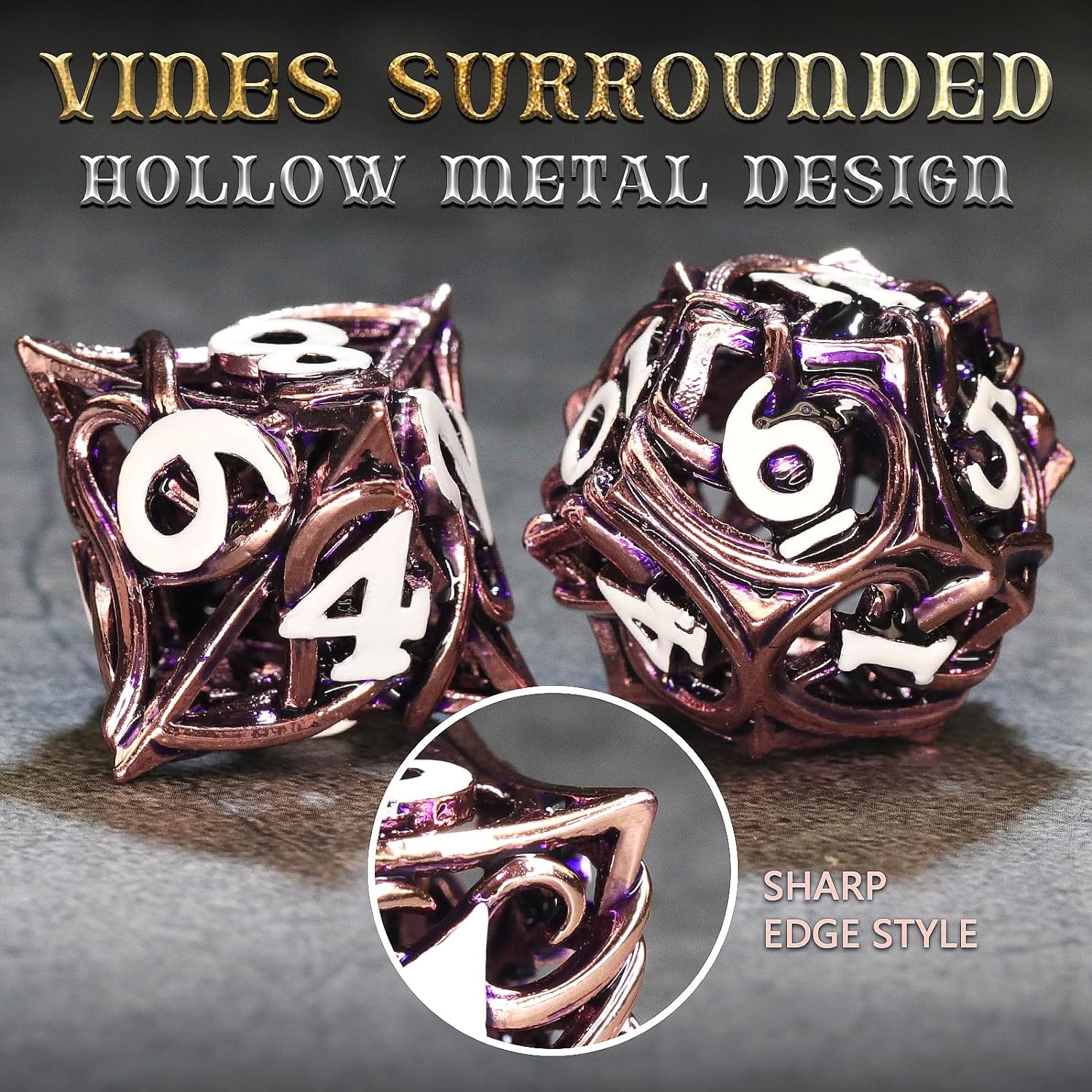 - 【Hollow Metal Dice】Full set weighs approximately 60g(2.1oz) and features a hollow design, making them lighter and more comfortable to roll. The vine lines and sharp coners make them feel great in the hand. Due to the durable coating, these gaming dice are resistant to wear and tear, preserving their smooth and non-fading appearance for years of continuous use.