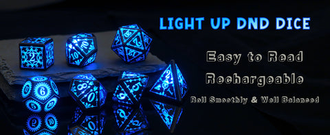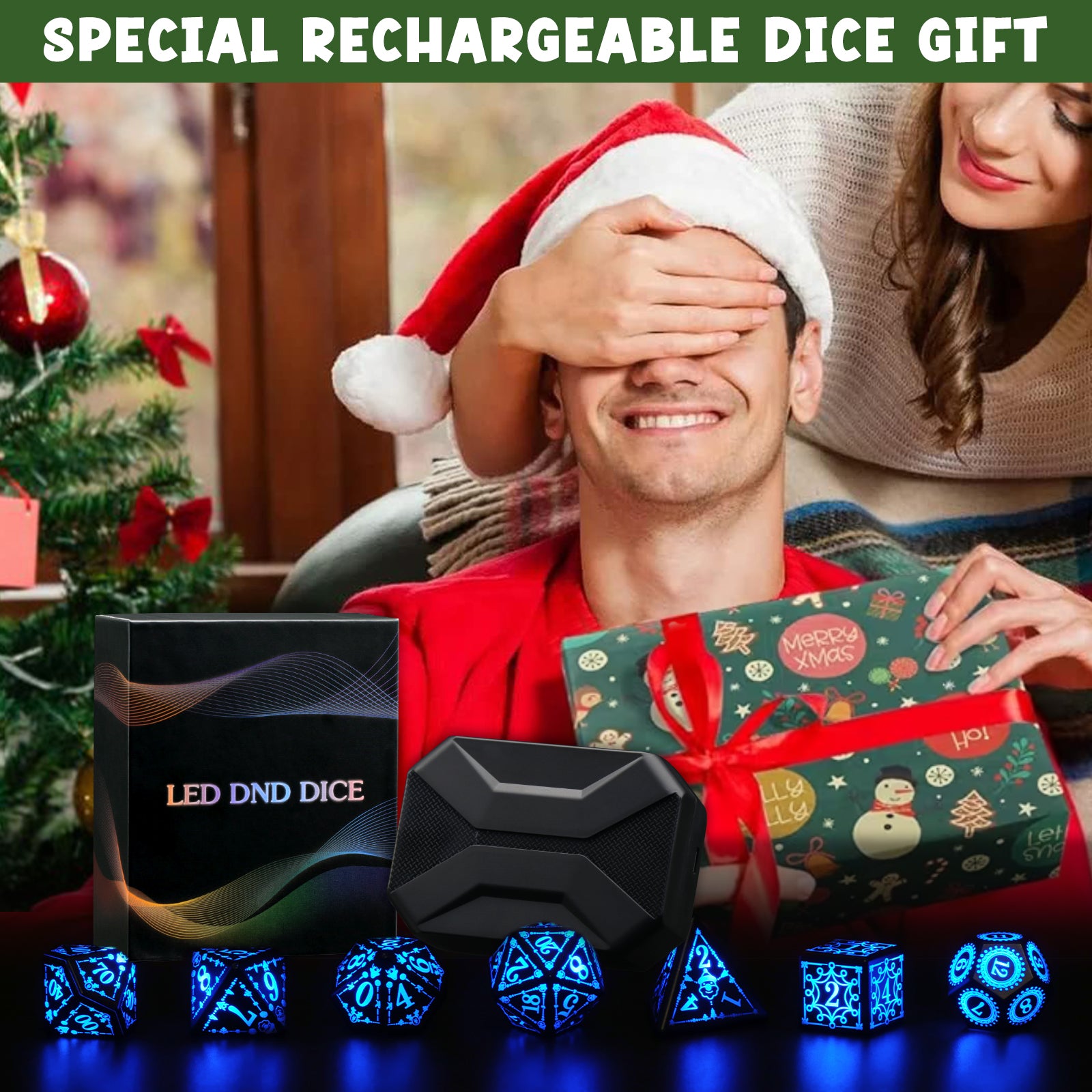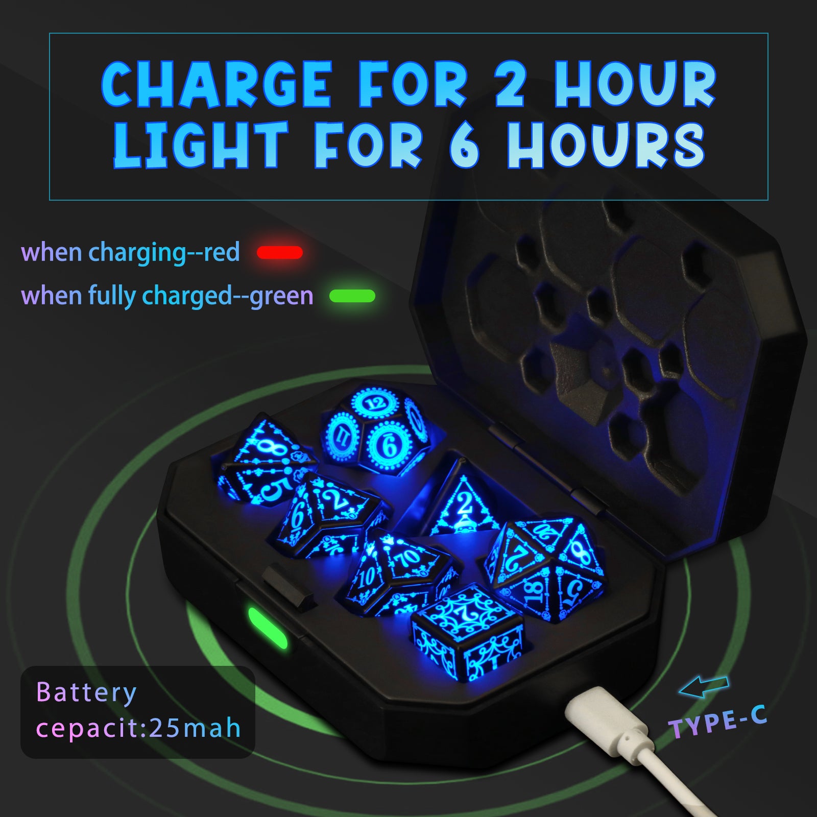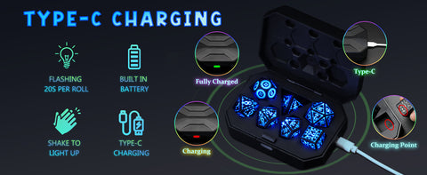 - Rechargeable LED Dice - A set of 7 dice come with a charging bin, type-c cable, instructions card and nice packing box, which is easy to carry to parties anytime and anywhere or as a perfect gift for D&D game players.