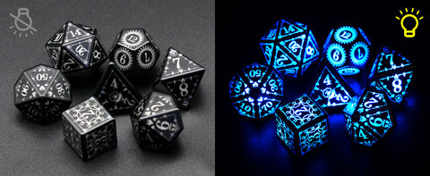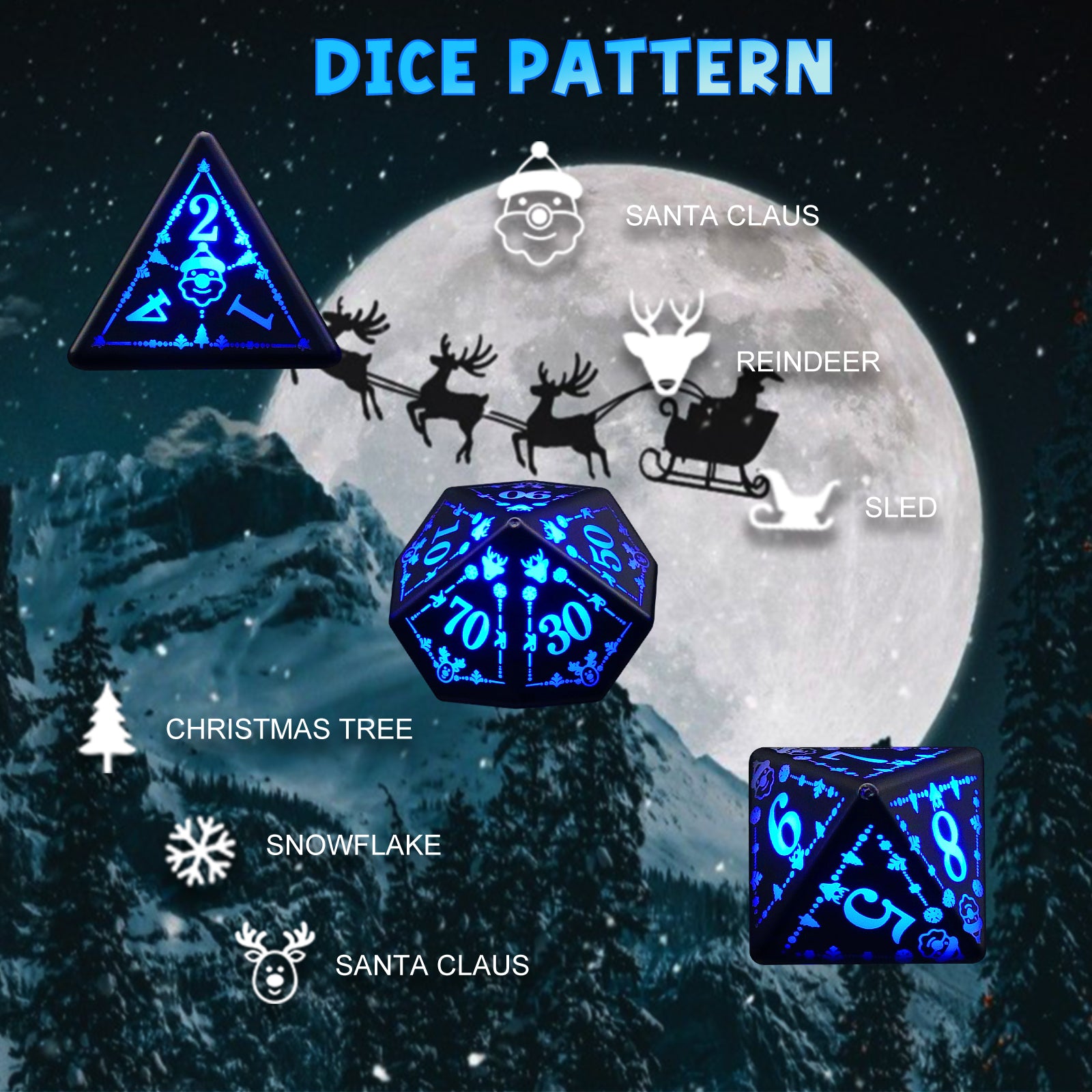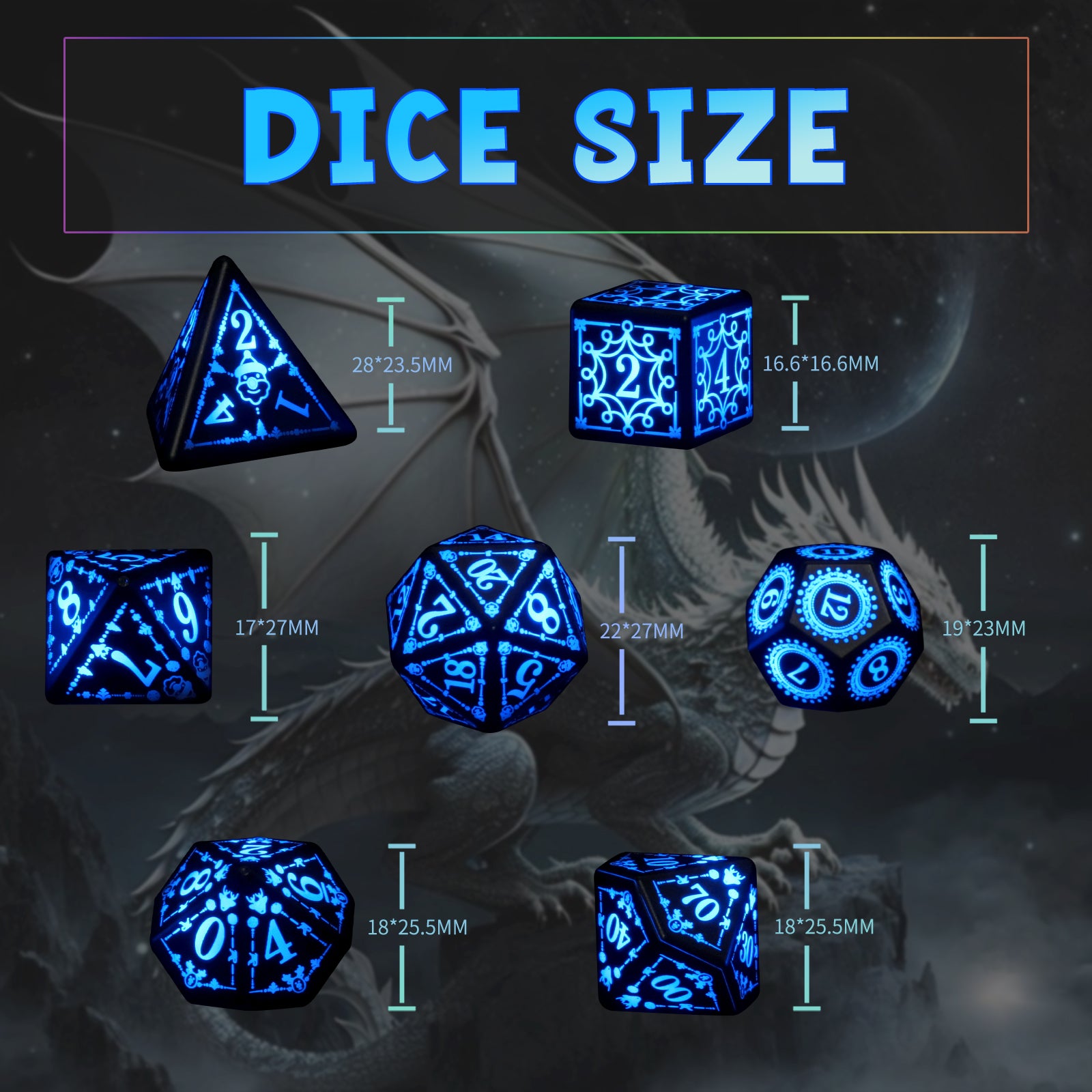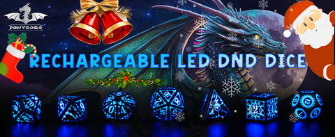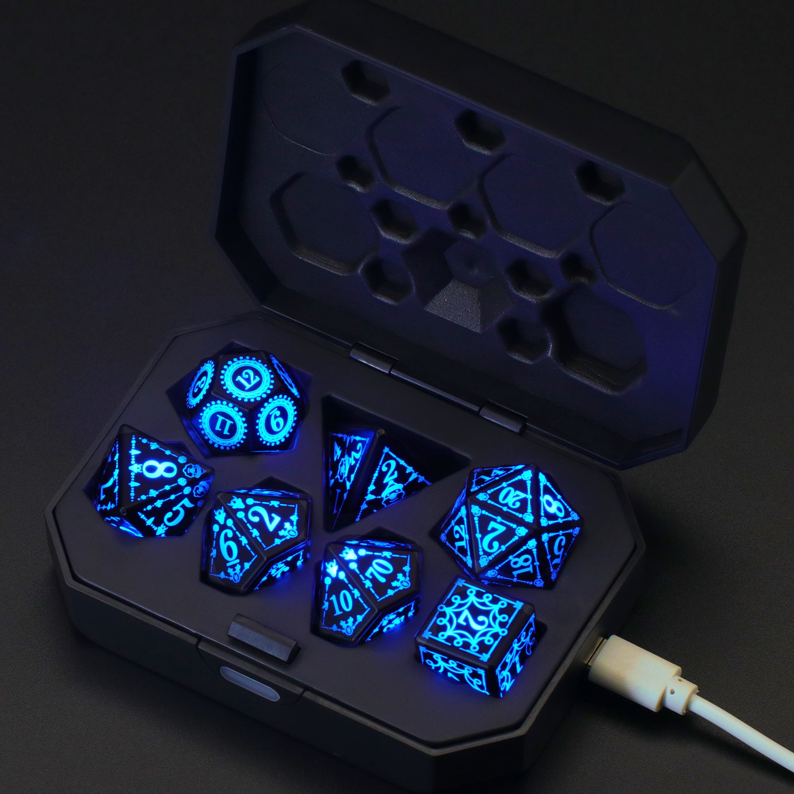 - Rechargeable LED Dice - A set of 7 dice come with a charging bin, type-c cable, instructions card and nice packing box, which is easy to carry to parties anytime and anywhere or as a perfect gift for D&D game players.