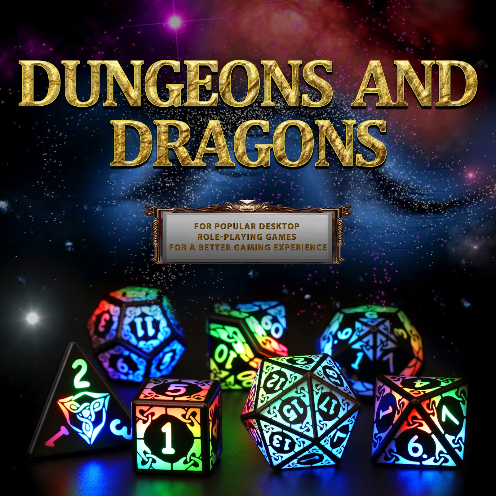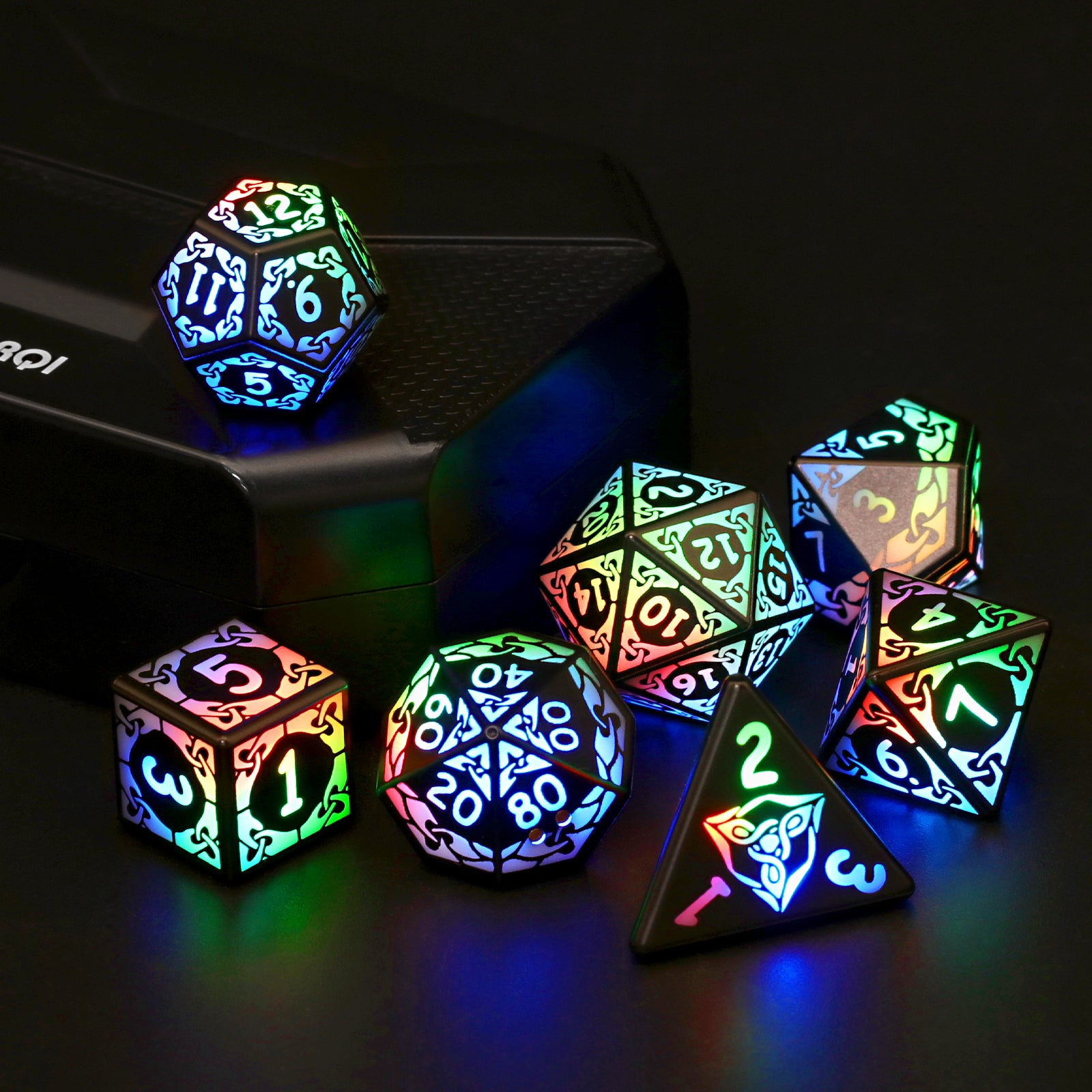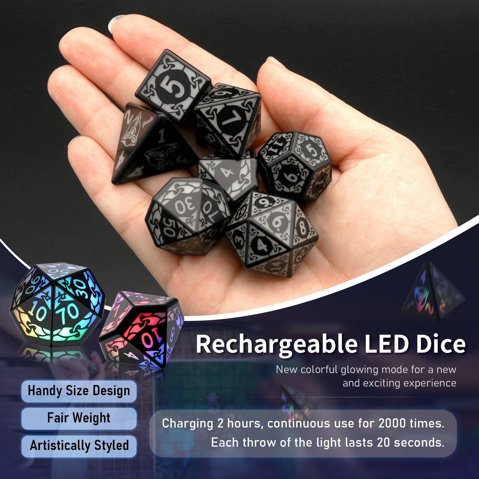 🎲【Colored Light Up Dice】Electronic dice set the appearance of the "interlocking" pattern design, like the feeling of chain confinement. When you shake the dnd dice, the light up dice will emit colored lights, the numbers on each side are as large as possible, easy to read, easy to light up, fun and easy to play with.