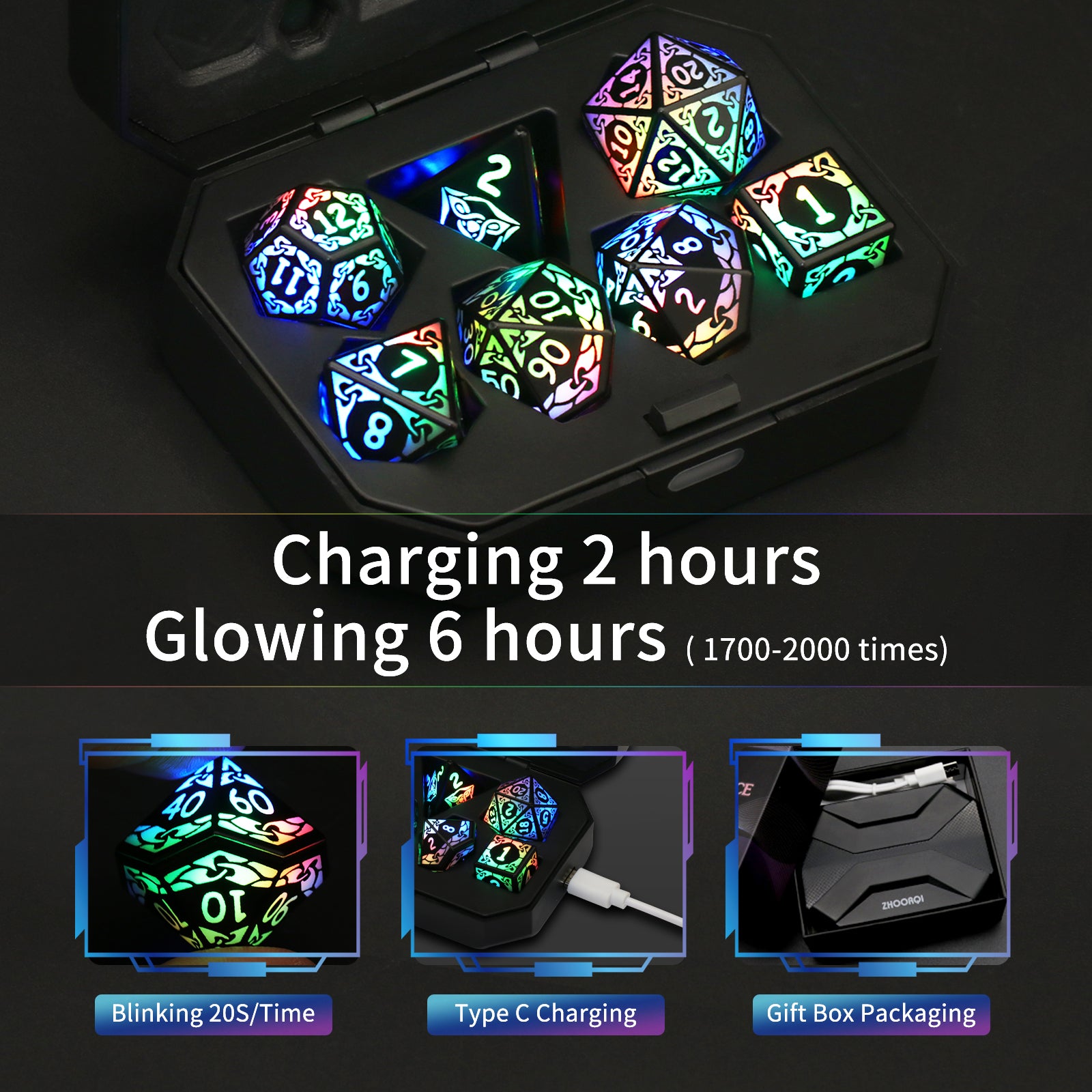 🎲【USB Rechargebable Dice】LED dice with a charging box with charging interface, which allows you easily charge these DND dice via power banks/power adapters/computers etc.Charges for 2 hours and continues to glow for 6 hours, can be used multiple times.