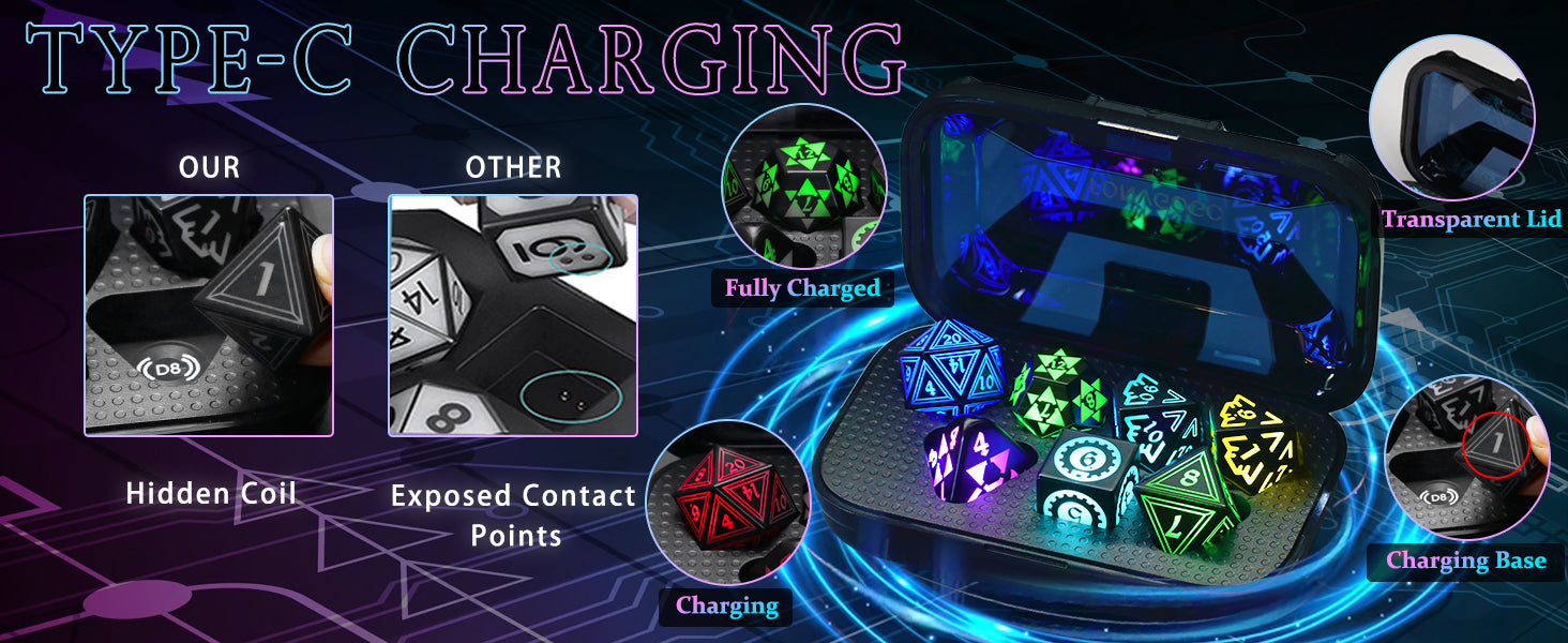 - RGB Charging Dice: The dnd dice feature an upgraded charging system - Simply place the highest-numbered side up in the charging case and connect via Type-C port. No more contact-point charging issues found in traditional LED dice