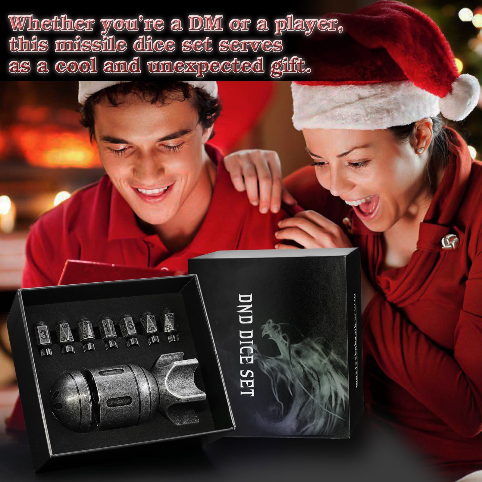 - IDEAL D&D GIFT: 7 bullet polyhedral dice and spinning missile container are packed in a cardboard case. Whether it's a birthday, Christmas, Halloween or special occasion, this dnd dice set will be an impressive gift for DnD enthusiasts and dice collector