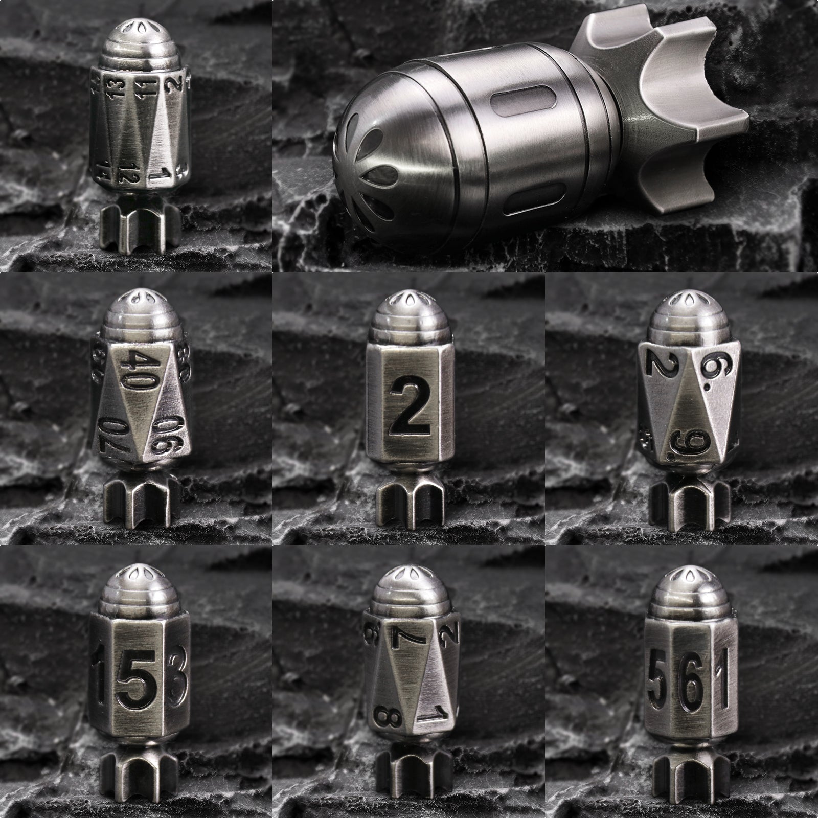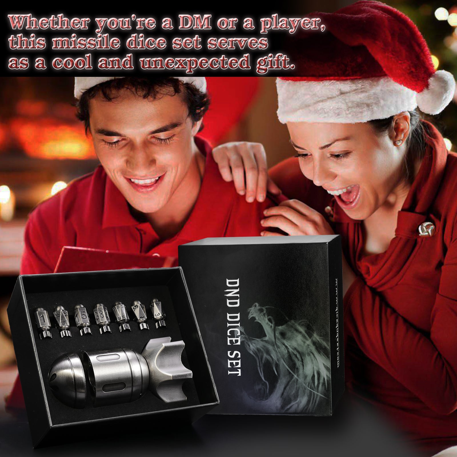 - IDEAL D&D GIFT: 7 bullet polyhedral dice and spinning missile container are packed in a cardboard case. Whether it's a birthday, Christmas, Halloween or special occasion, this dnd dice set will be an impressive gift for DnD enthusiasts and dice collector