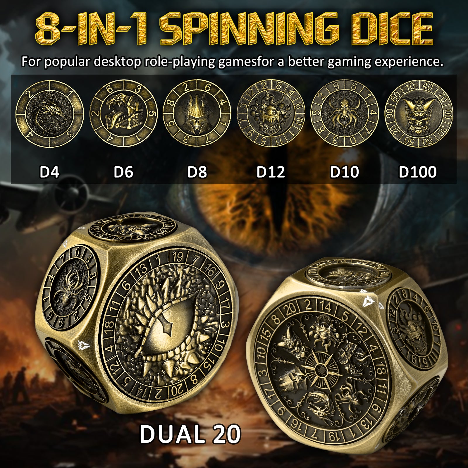 - 🦾 8-IN-1 Full Functionality With Dual D20: Upgrade your gameplay with this innovative 8-sided spinning dice. It replaces your entire dnd dice set, featuring dedicated faces for D4, D6, D8, D10, D12, D100, and a unique DUAL D20 for rolling advantage/disadvantage in D and D 5e. All functions are precision-engineered into a single, hefty metal dice